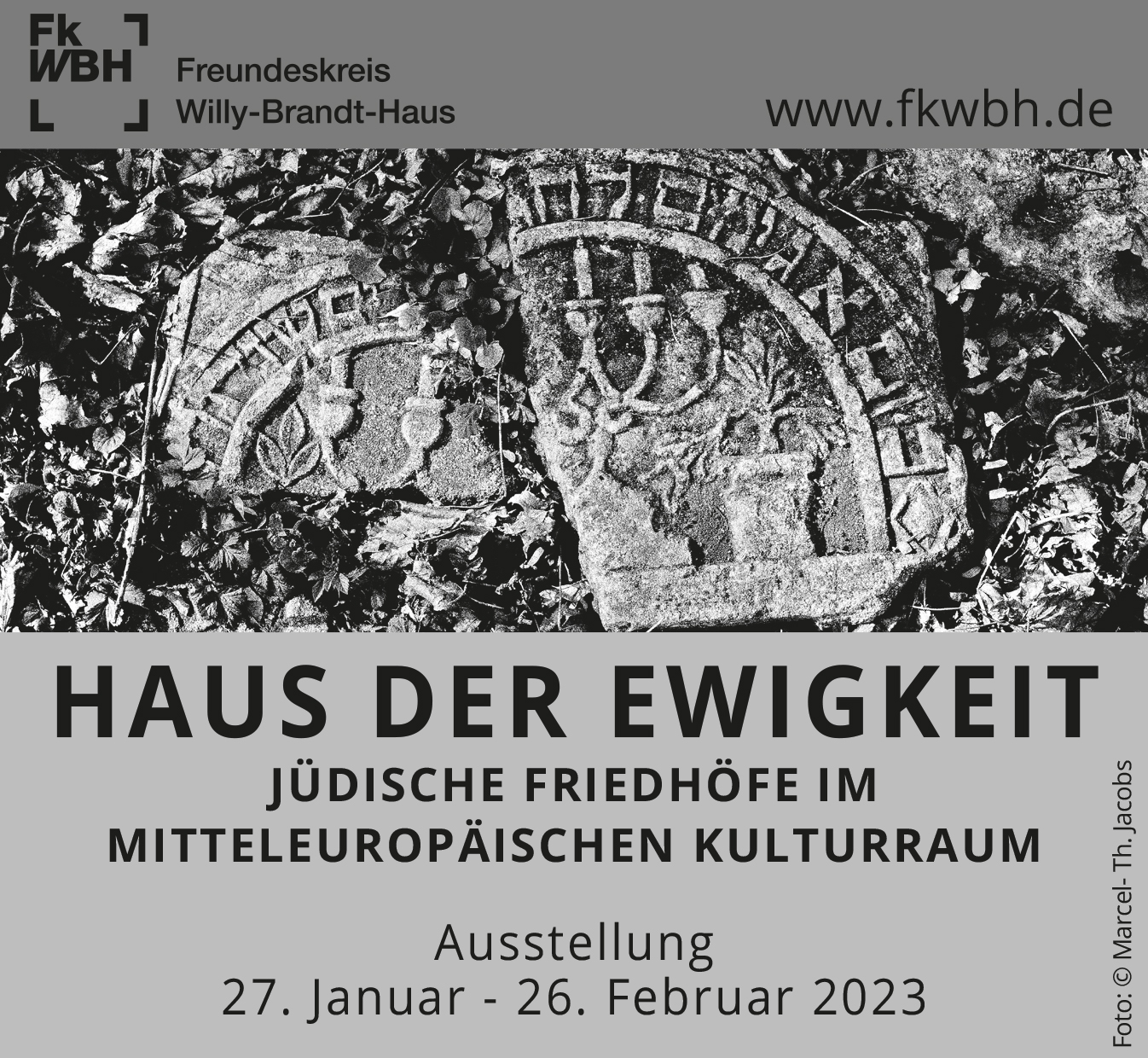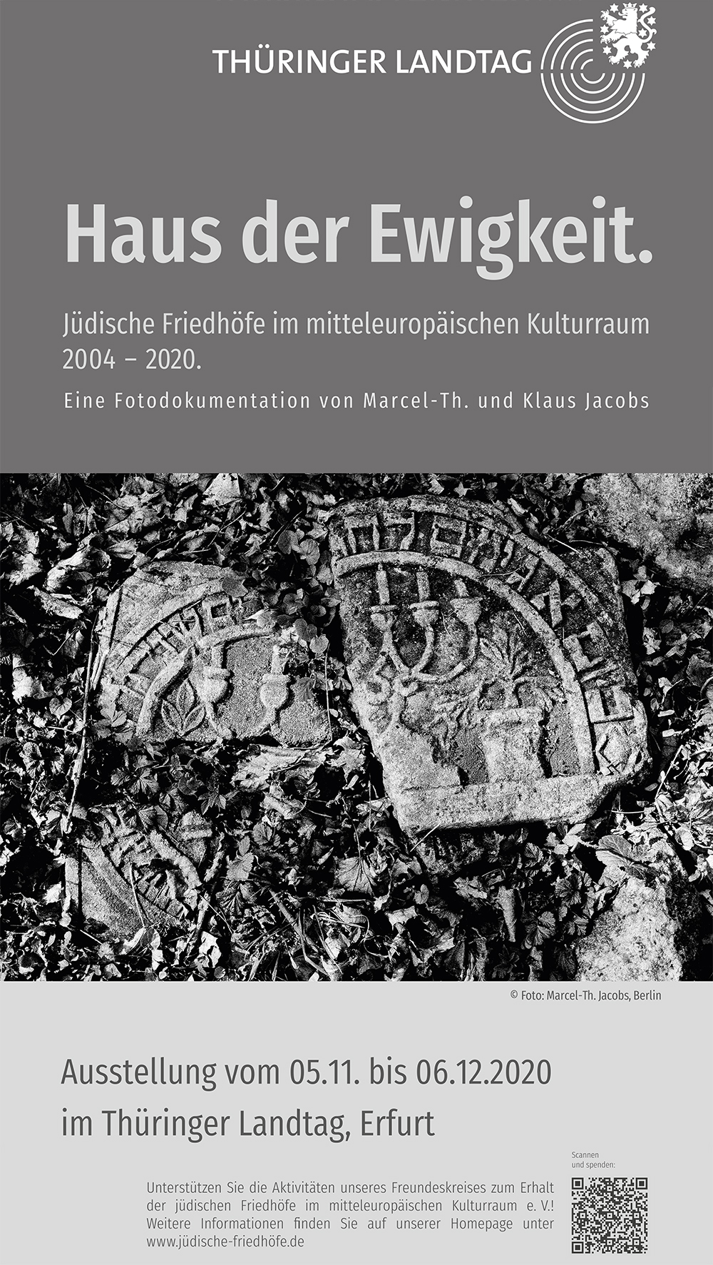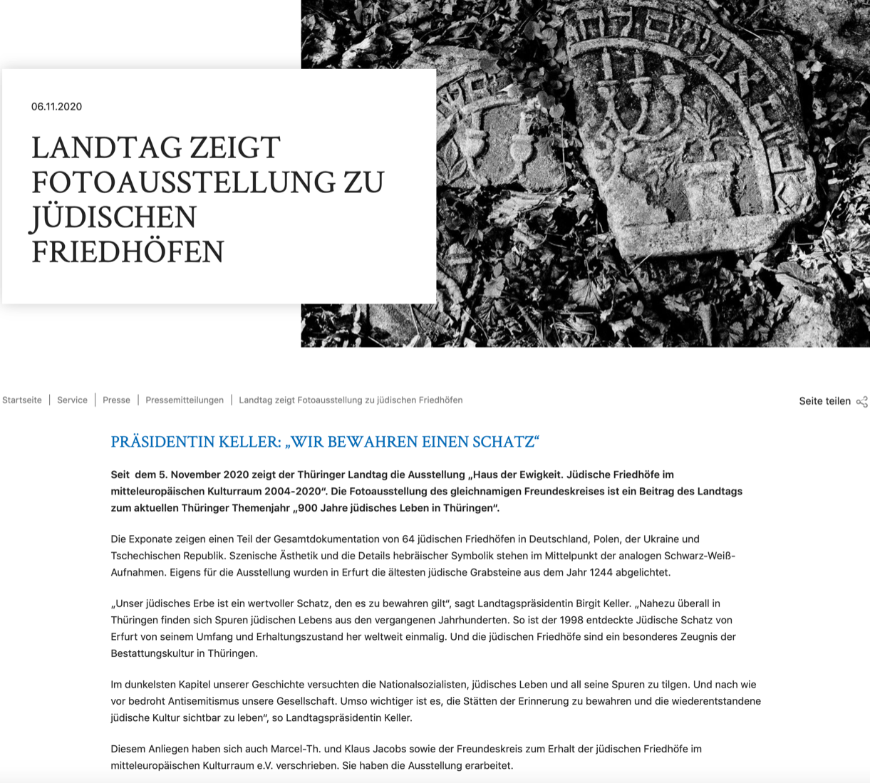 Marcel-Th. Jacobs tastet sich voran über ein dichtes Beet aus Efeu, das sich auf dem Boden ausgebreitet hat. Dazwischen stehen Grabsteine, mal vollständig, mal zerbrochen oder halb im Boden versunken. Normalerweise hat er bei solchen Rundgängen seine Kamera dabei, eine Leica mit der er analoge Schwarz-Weiß-Bilder macht. Er fotografiert Details auf den Steinen wie Levitenkanne, Menora oder Tierbilder, aber auch die Friedhofslandschaften wie weite Grabsteinfelder und lange Wegschneisen zwischen Bäumen. „Die Symbole und Inschriften kehren in allen Ländern immer wieder“ erzählt Marcel-Th. Jacobs. Für die schwarz-weiße Analog Fotografie hat er sich ganz bewusst entschieden. „Die Fotos, die ich erstellt habe und auch ausstelle werden ja nicht bearbeitet. Das sind Zeitdokumente sozusagen, das ist der Anspruch, es wird nichts aufgehübscht oder verschönert, sondern es wird genauso abgebildet wie es ist“. Kunstvoll sehen die Fotografien trotzdem aus.