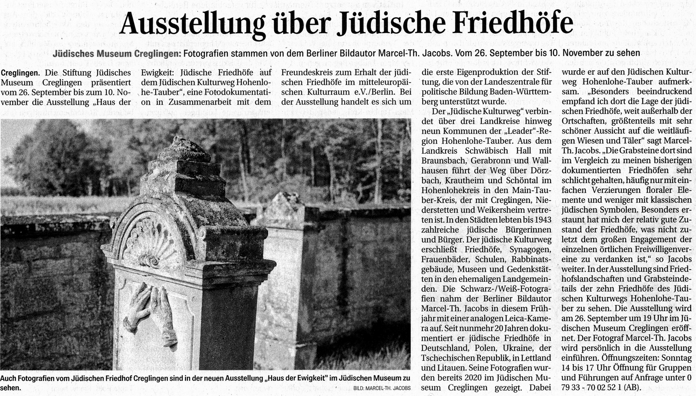Es sind nur die jüdischen Friedhöfe, die noch von den einst so lebendigen jüdischen Gemeinden berichten, sagte der Berliner Bildautor Marcel Th. Jacobs bei der Eröffnung der Ausstellung „Haus der Ewigkeit“ im Jüdischen Museum Creglingen.